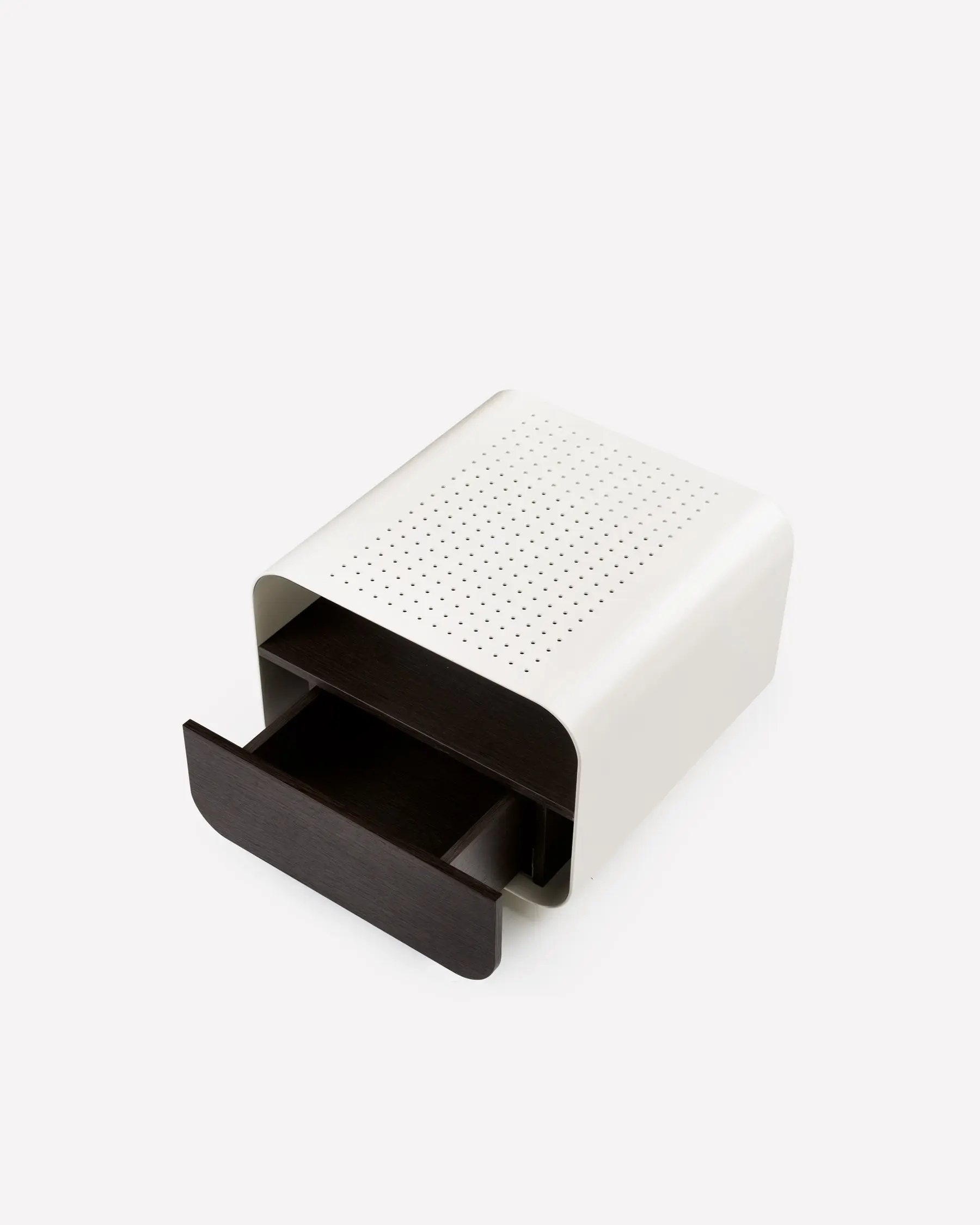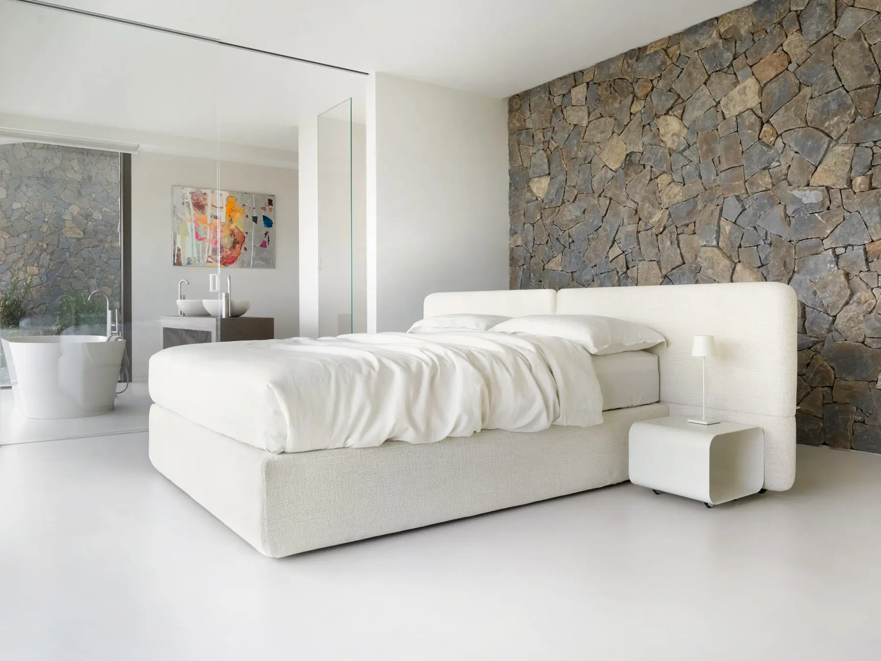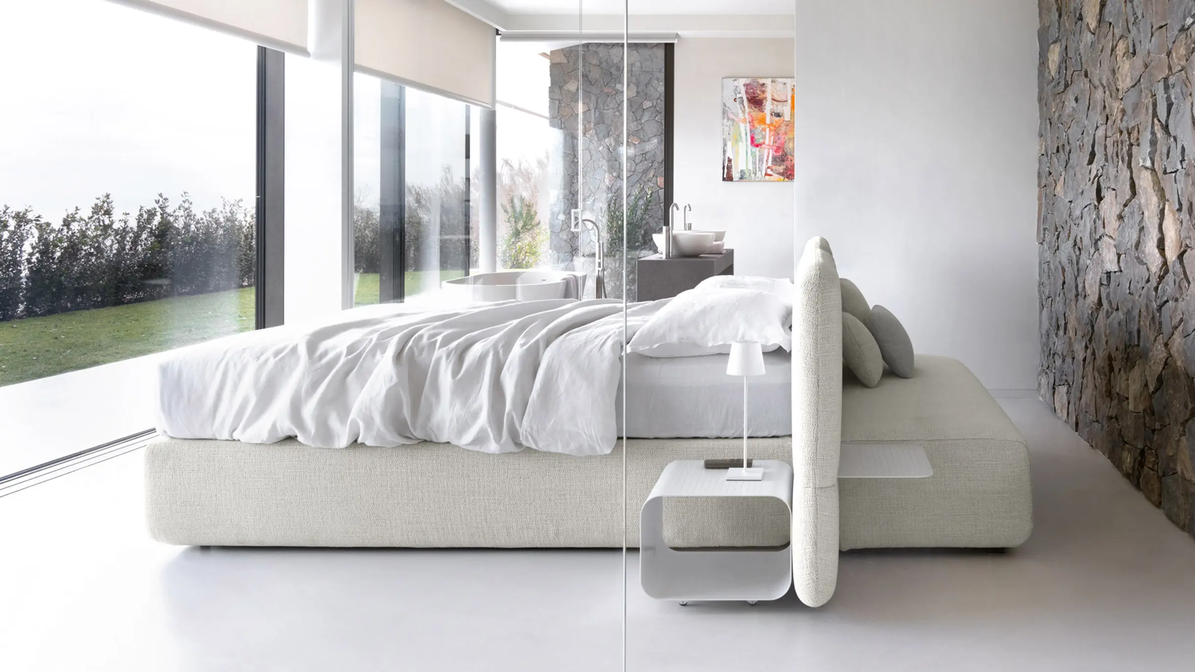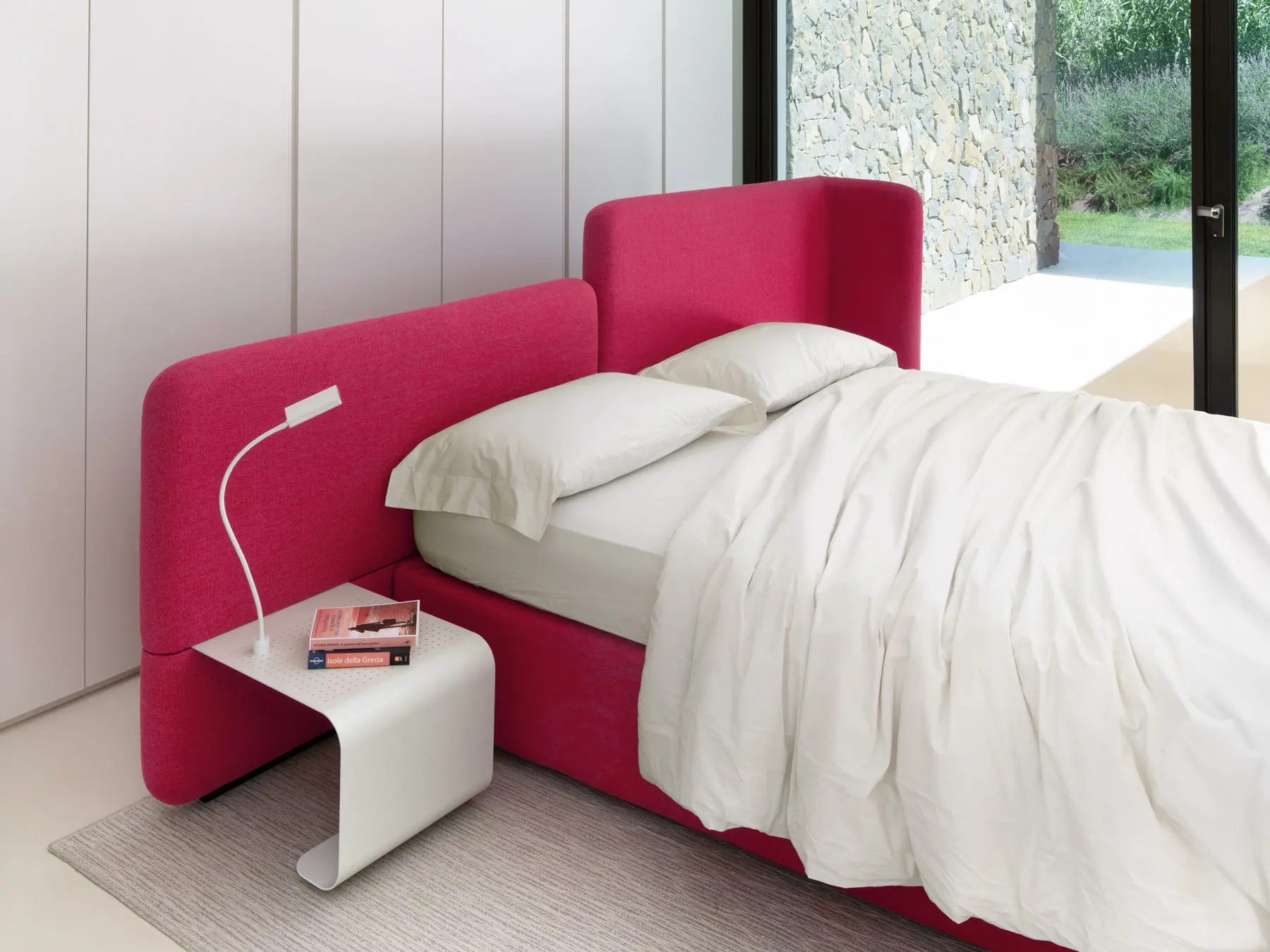 Un tavolino con cassetto e lampada integrata: non solo appoggio, ma gesto quotidiano che rende la zona notte più intima e funzionale.