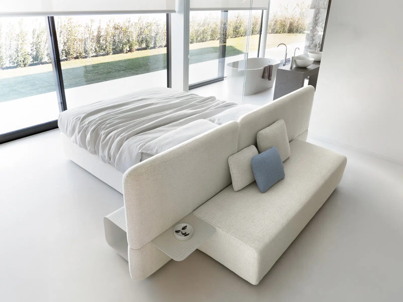 Accessori integrabili in diverse forme e dimensioni — quadrati, rettangolari, triangolari, a tasca o Elle — che si adattano a letto e divano offrendo appoggi eleganti, contenitori discreti e dettagli funzionali.